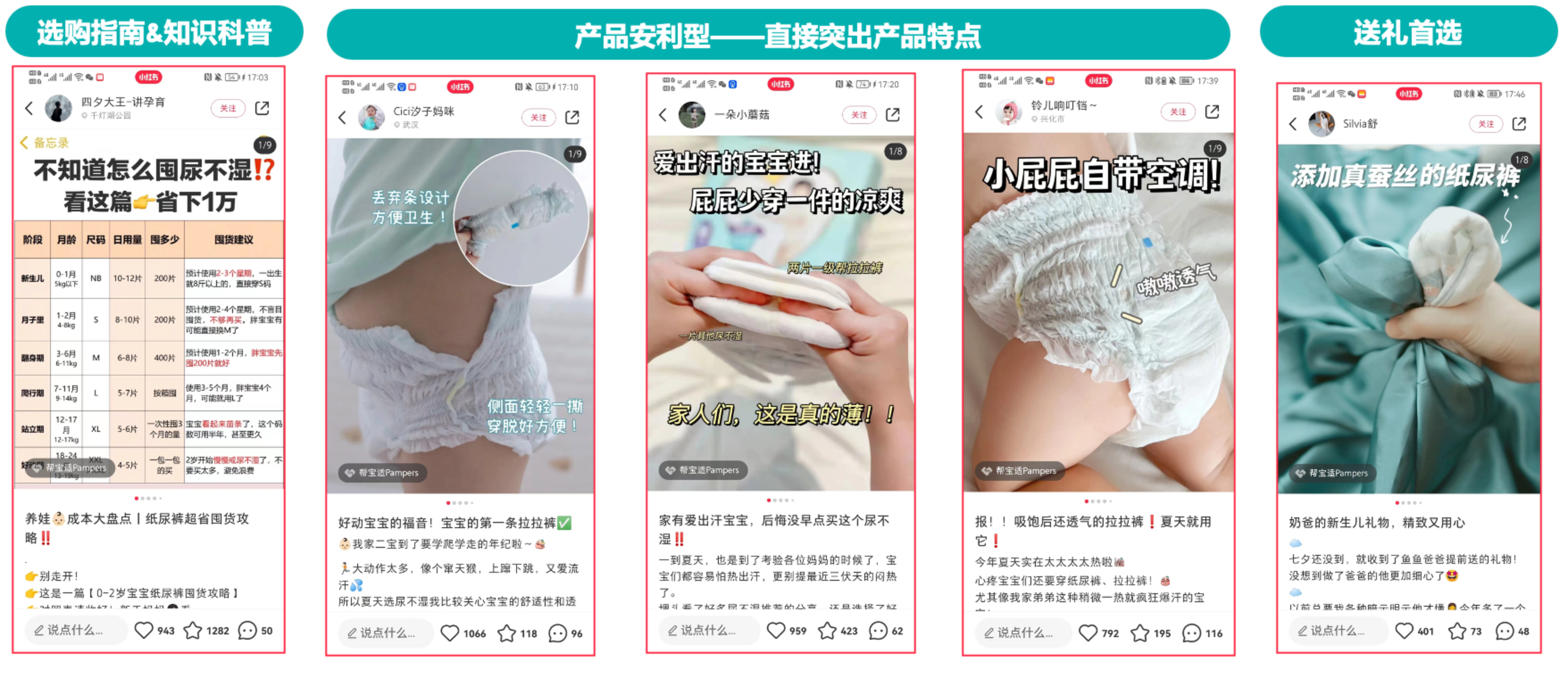 第二个方向则通过人群包定向创新「搜索词」,覆盖孕中晚期、0-6岁新生儿、7月-3岁母婴等相关人群,并针对不同人群进行差异化的沟通,构建知识科普笔记、产品安利型笔记、送礼首选的内容矩阵。