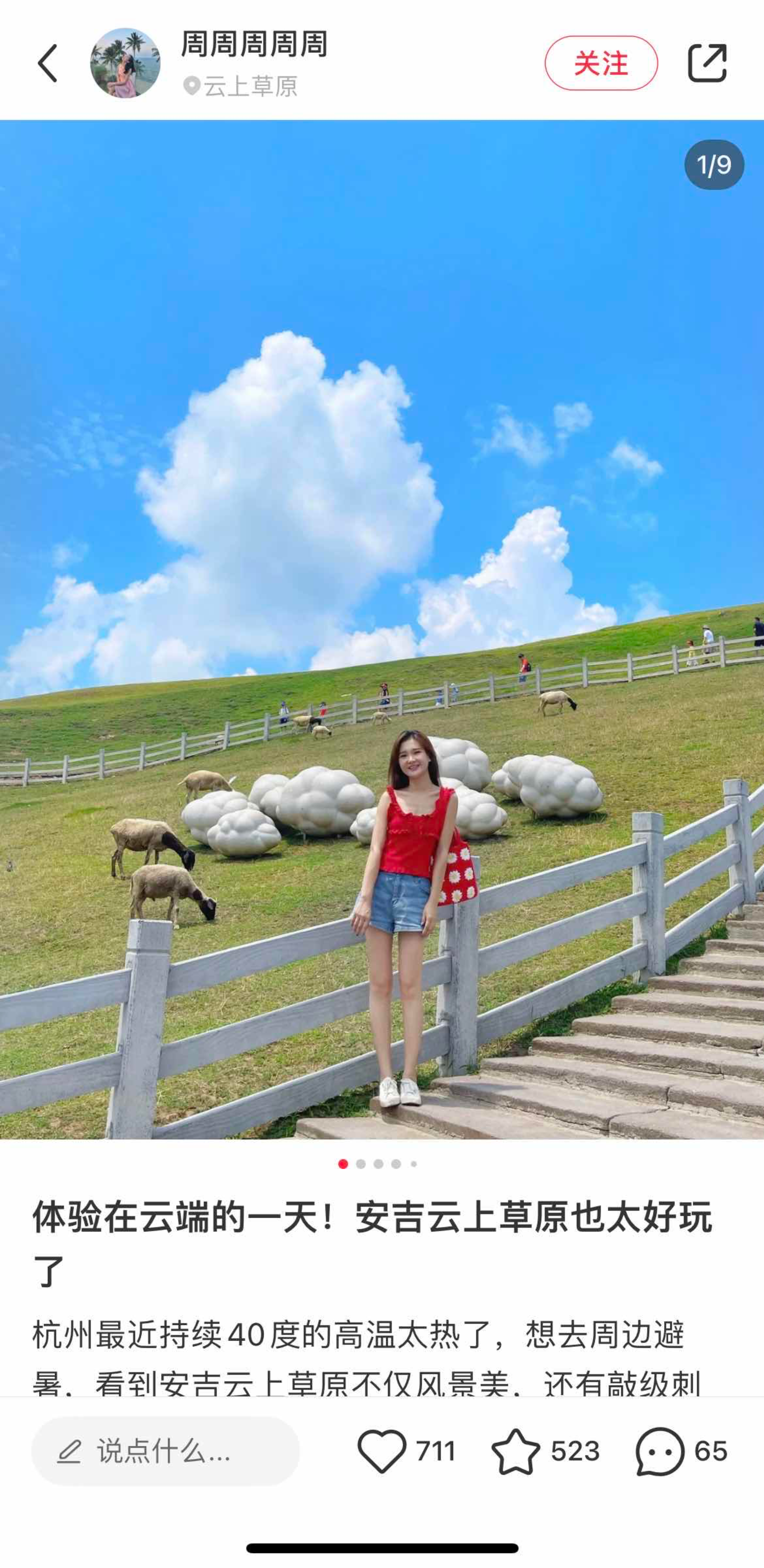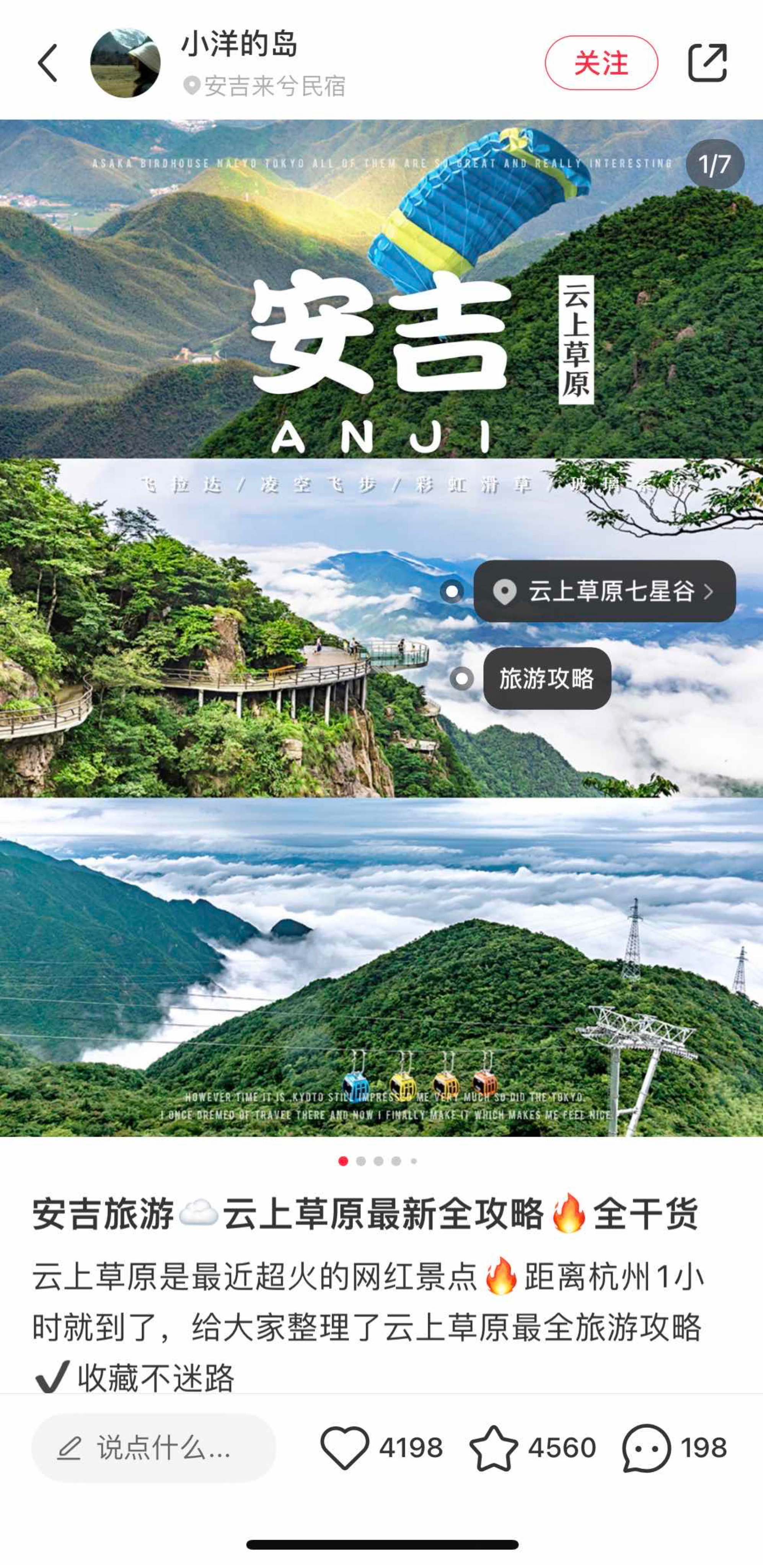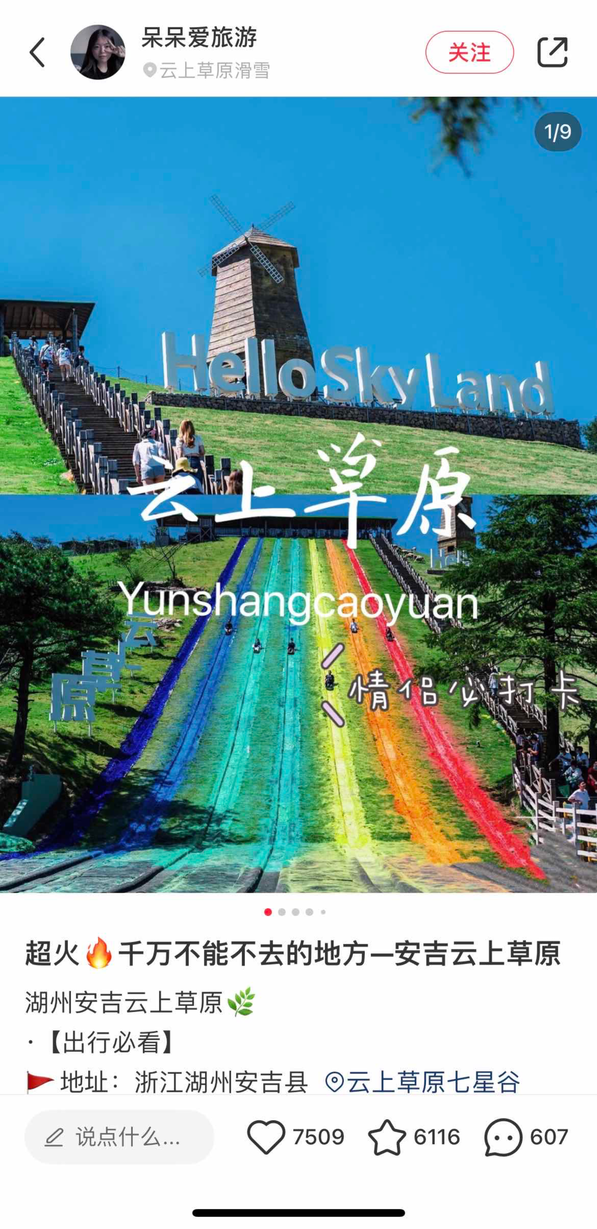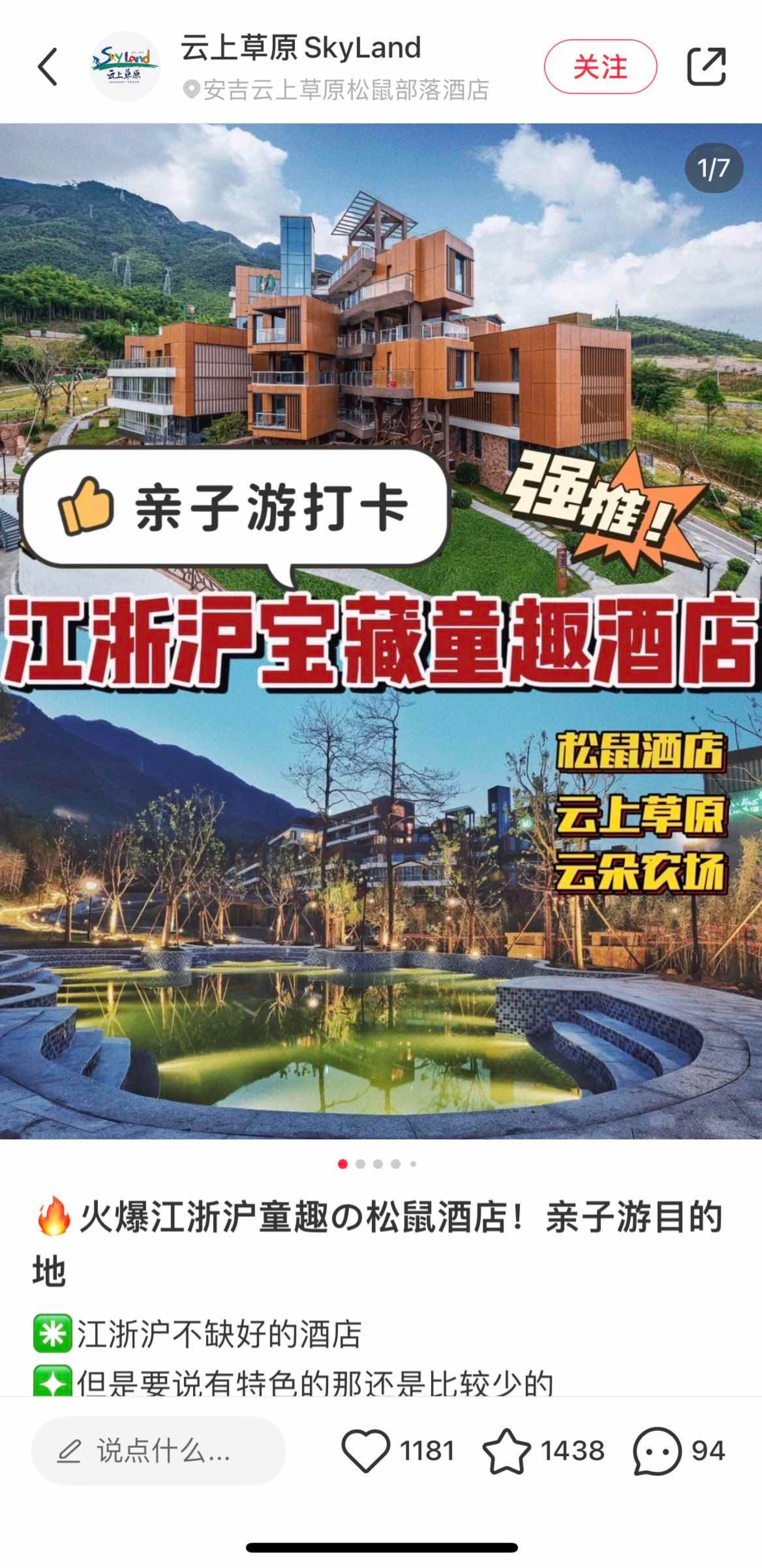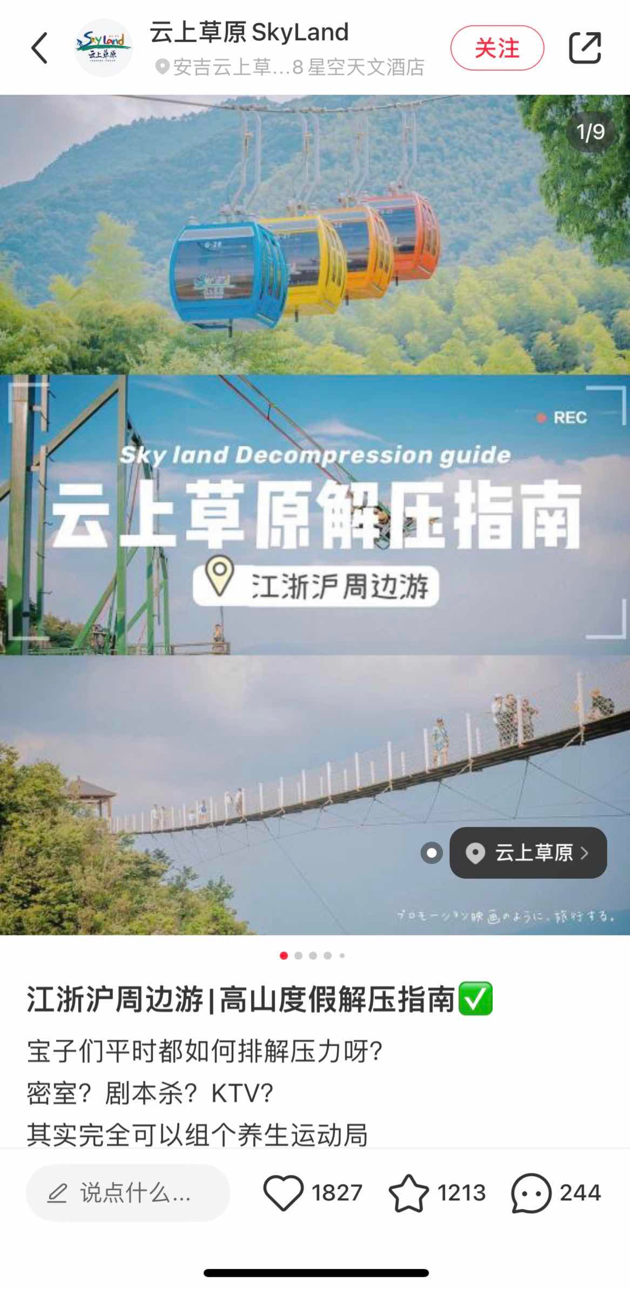在景区笔记的内容上覆盖景区内的热门景点及游玩攻略,提炼适合推广景区的卖点,例如温度更低适合避暑、亲子游玩项目多、可以和小动物零距离、解压旅行。在标题中预埋关键词,如江浙沪周边游、安吉云上草原品牌词等。
