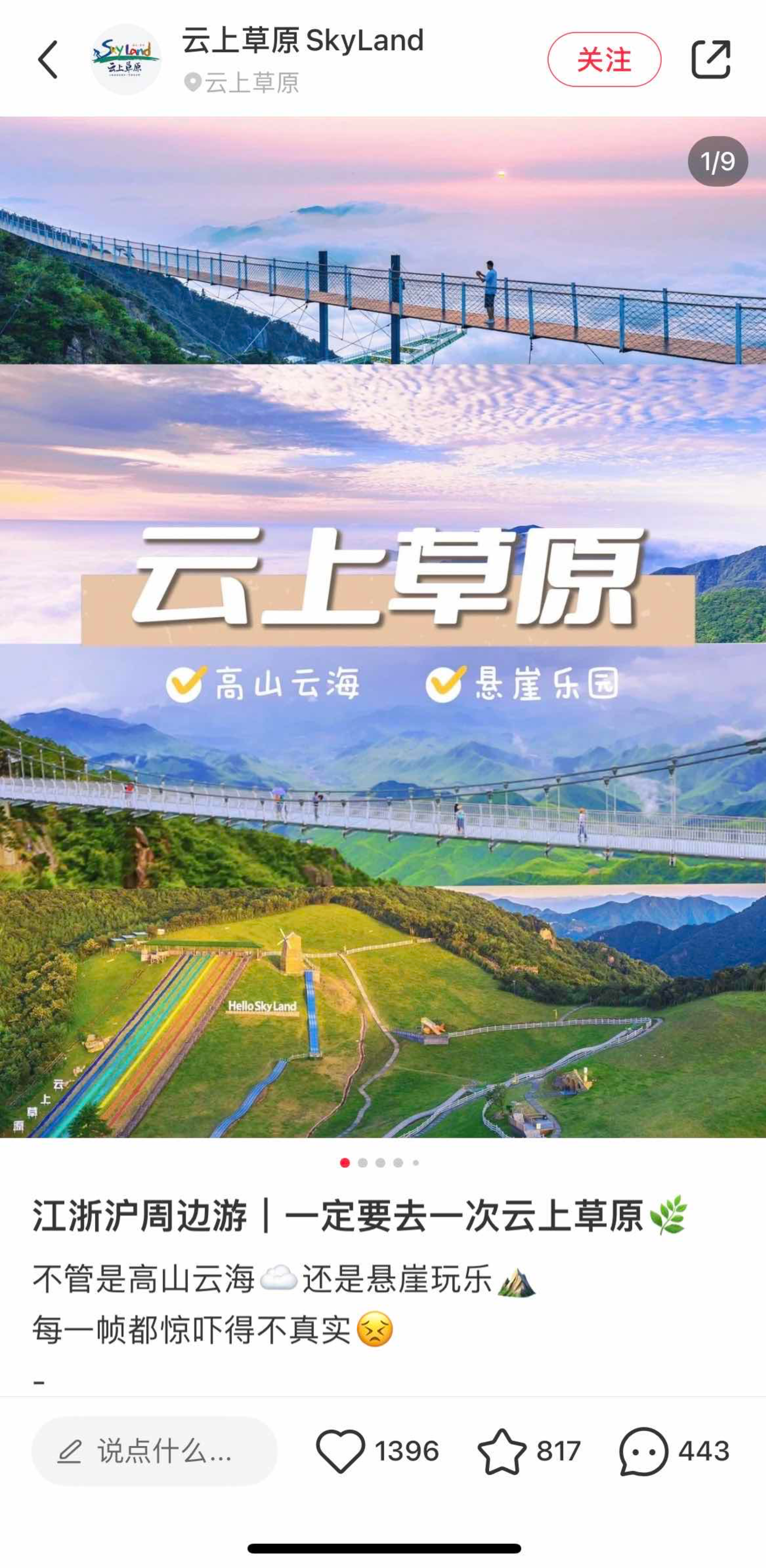 云上草原Skyland(以下简称云上草原)作为江浙沪周边游热门景区,位于浙江湖州安吉,是一个包含了多种游玩项目和景色特征的综合性高山四季旅游度假区,面对周边游的爆火,云上草原如何抓住旅游红利,承接逃离都市的人们,撑起诗与远方的想象与期望?云上草原选择和小红书灵感营销一起,开启了一场「旅游+直播」营销玩法的探索。
