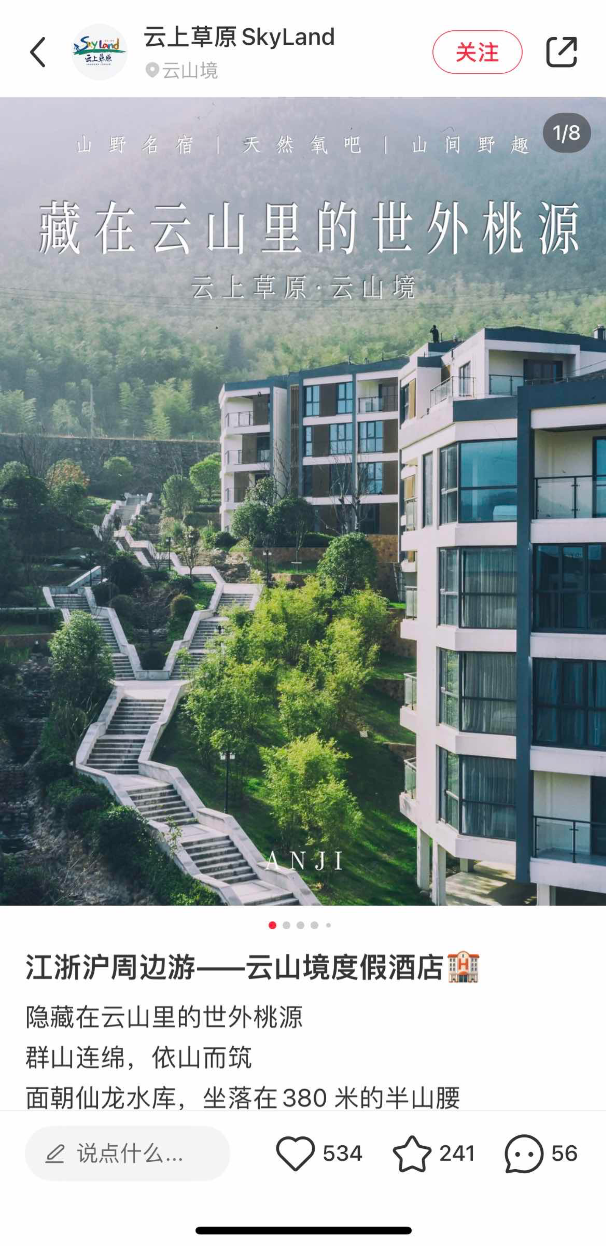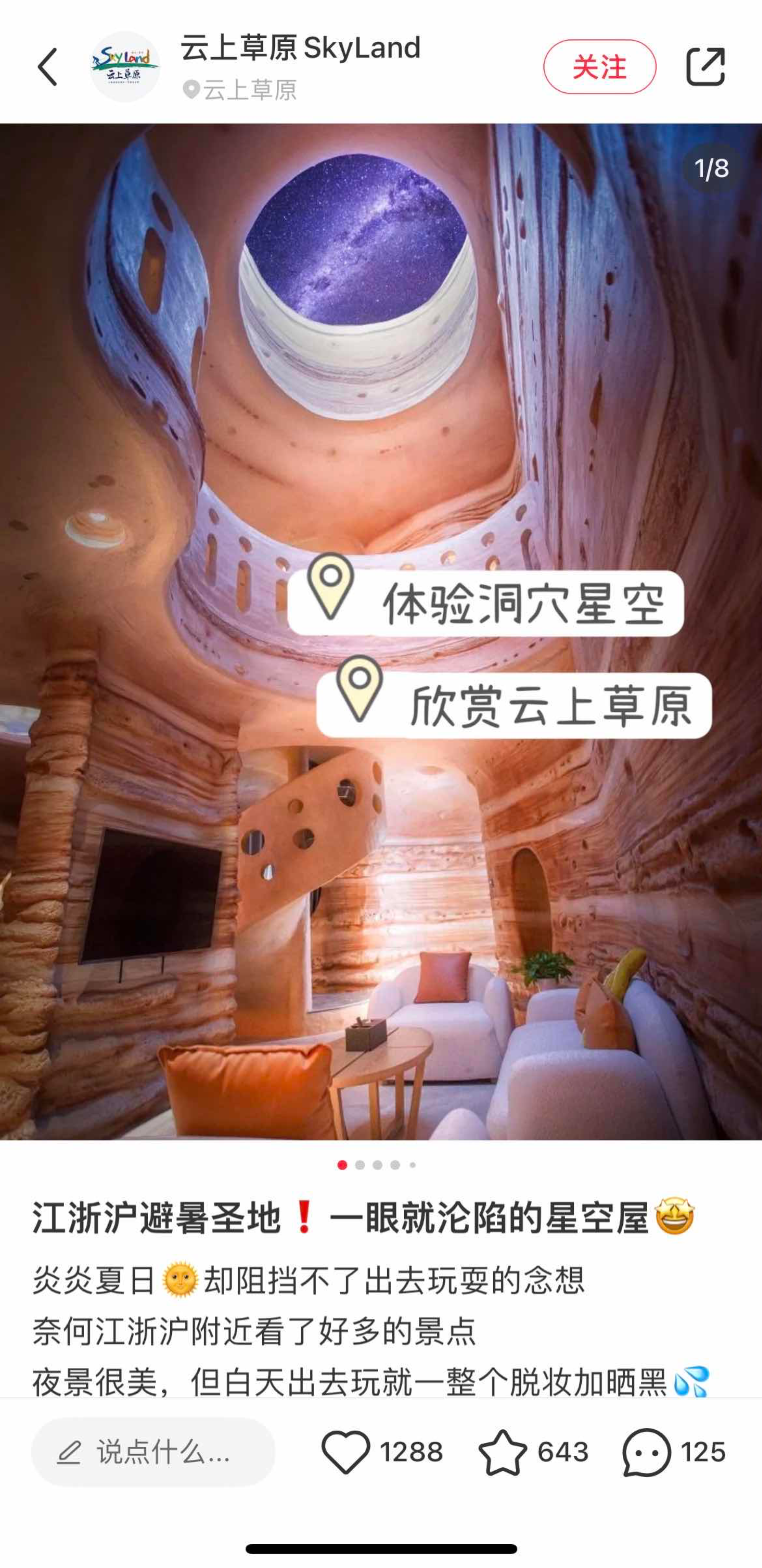 在酒店笔记中着重分产品介绍,针对三家不同产品定位的酒店,分人群、分卖点进行内容设计,例如松鼠酒店主打亲子;云山境酒店主打空间大,设施齐全;星空天文酒店主打高端网红风等等。单独提炼卖点,单篇介绍单个产品,方便用户从适合自己的卖点上去选择产品。