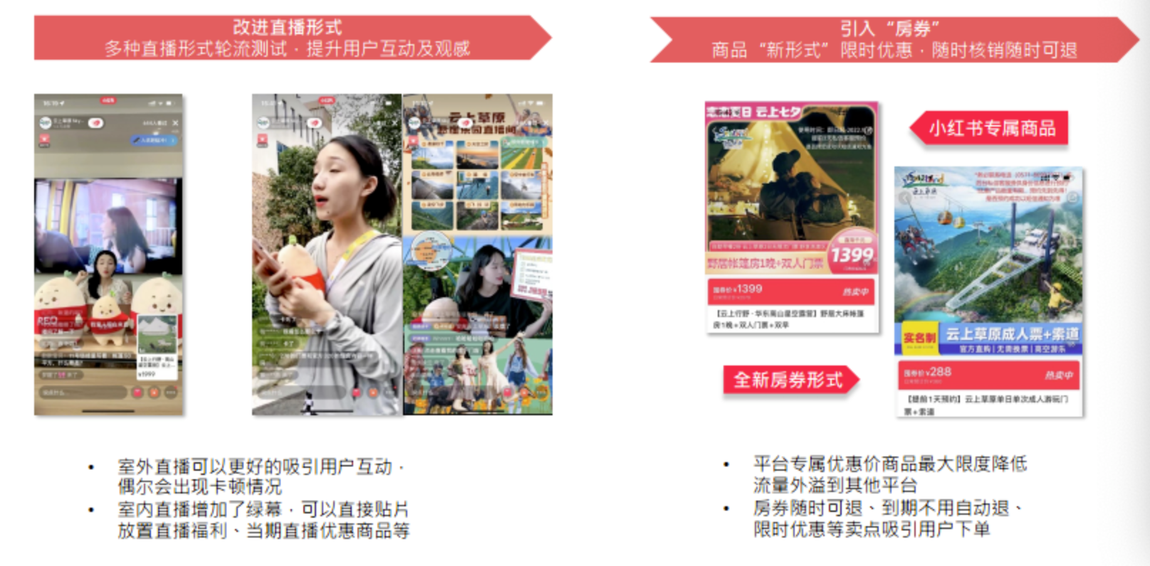 2、打通直播路径,优化直播场景:前期进行直播测试,证明路径的可行性,随后对直播间场景进行优化,添加小红书专属商品,使用创新商品形式,吸引用户观看和下单。
