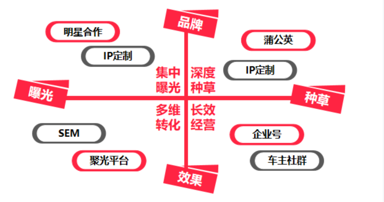 通过明星合作和IP定制的方式,集中放大声量,覆盖种草人群;借助蒲公英进行达人合作,配合站内IP,深度抢占女性汽车用户心智;通过聚光平台搜索广告承接前期声量,精准锁定目标人群,促进高效转化;最后通过企业号将品牌粉丝沉淀为车主社群,形成品牌人群资产,保持品牌的畅销运营。