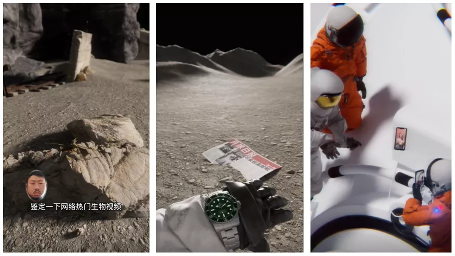 更有意思的是,即使身处月球,也能与地球网红互动:看抖音会刷井川里予的舞蹈视频、遇到不认识的生物会艾特无穷小亮鉴定、就连千万播主可爱屁露脸,也能登上月球日报的头版......