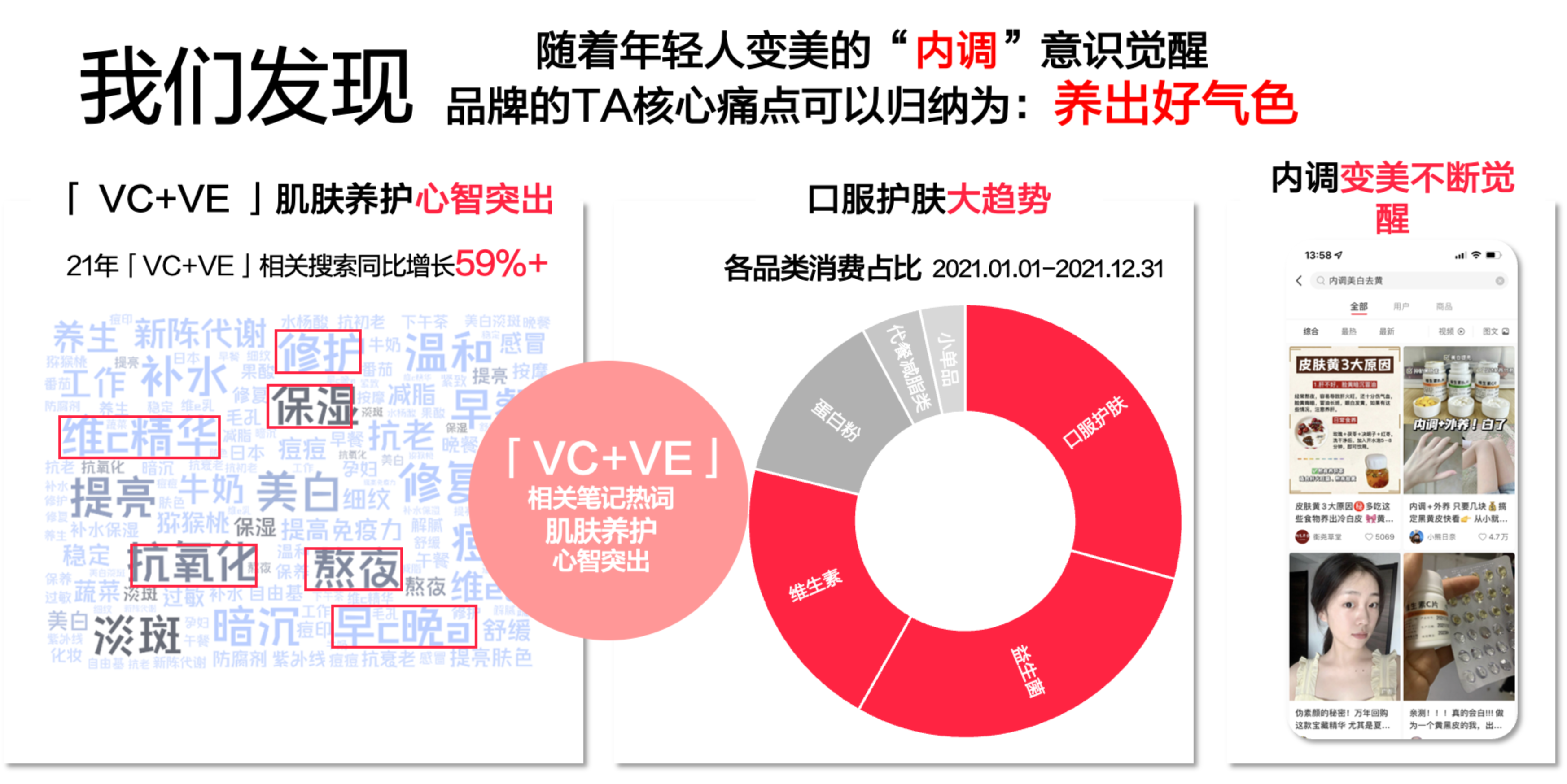 借助小红书数据洞察,养生堂发现,在人群方面,保健品目标用户和美妆护肤人群的贴合度更高,随着他们的护肤理念更为科学,从「外用」转向注重「内调」成为护肤新趋势,「内调」近一年搜索涨幅最高达751%;在成分方面,「VC+VE」肌肤养护心智突出;而在功效场景上,美白和抗衰成为热门场景。