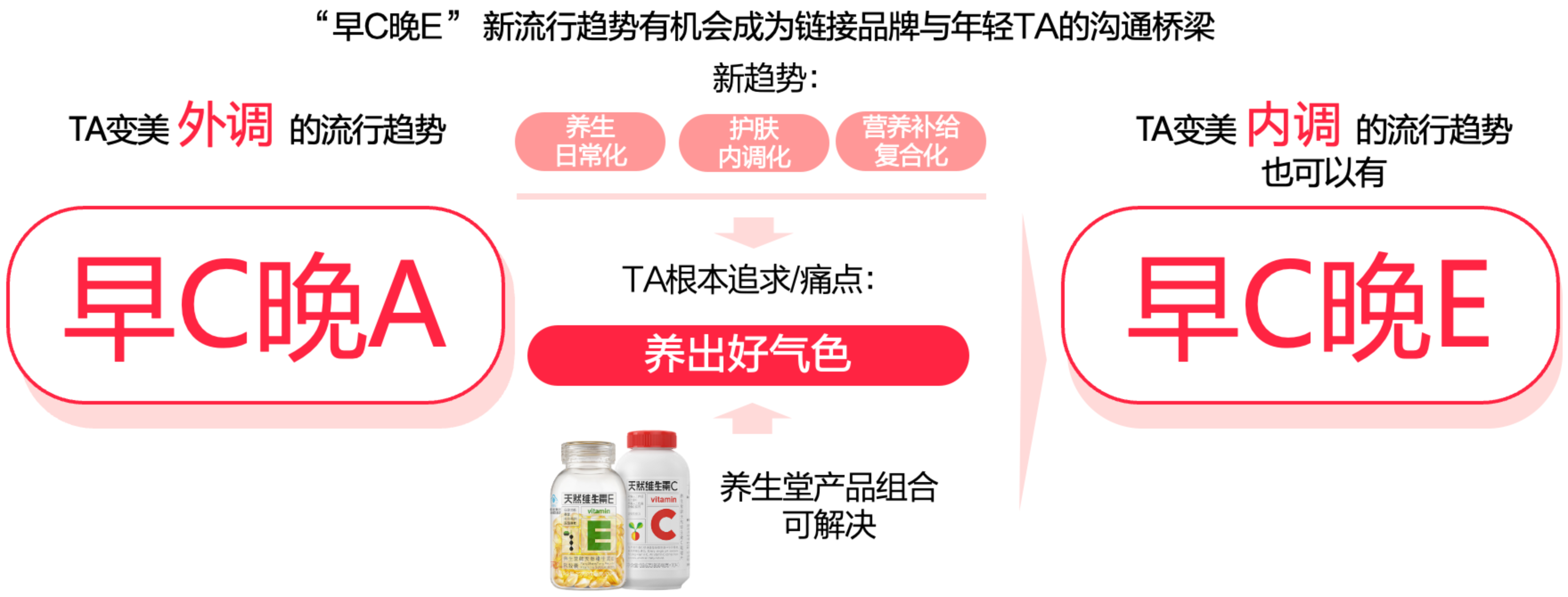2.创新内调护肤公式:通过年轻人喜闻乐见的方式,将护肤界的热门公式「早C晚A」转译为保健届的「早C晚E」,有效提升产品的用户认知度。