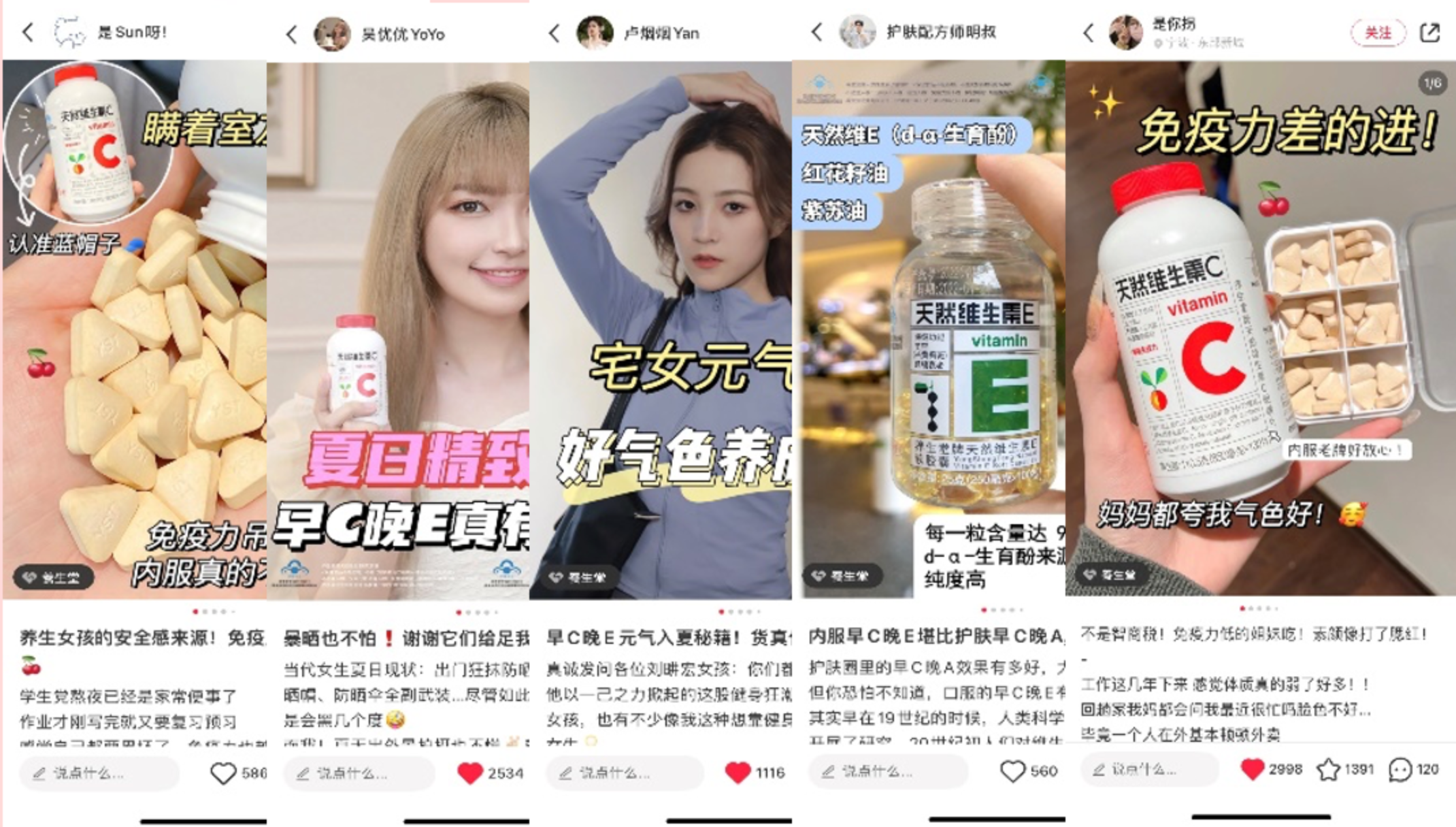 确立产品后,养生堂从小红书站内热门护肤公式「早C晚A」出发,借流行趋势搭建起品牌与年轻人对话的「桥梁」,打出王牌产品组合拳,创造出内调护肤的流行新趋势——「早C晚E」,即早上服用维生素C美白肌肤,晚上服用维生素E达到抗衰效果,覆盖美白和抗衰两大赛道,引爆内调护肤潮流。