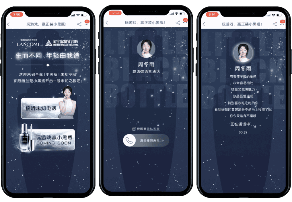AI大数据为本次兰蔻造物节线上线下体验核心, 从肌肤检测到定制小样,互动体验皆通过现场领取的个人数据卡片串连。其中, 联合阿里巴巴AI语音研究院打造的小黑瓶神秘电话亭,利用自研的KAN-TTS的声音克隆技术,结合阿里大数据标签, 让品牌大使周冬雨像朋友一般与你对谈。