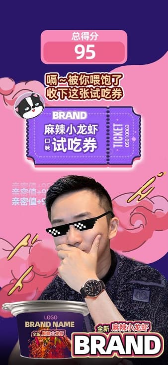 通过与明星互动的场景,以AR技术识别用户握筷手势,即可满足喂爱豆吃火锅的心愿。用户通过手势上下移动来控制喂吃烫捞的节奏,在互动中化作美味温度指数。当用户完成爱豆喂食后,爱豆会反馈相应的害羞,震惊等表情,更会通过“亲密度+1”震撼视觉与用户产生积极互动。最后,爱豆回赠天猫超市新品试吃券,通过领取机制促进新品尝鲜与购买。