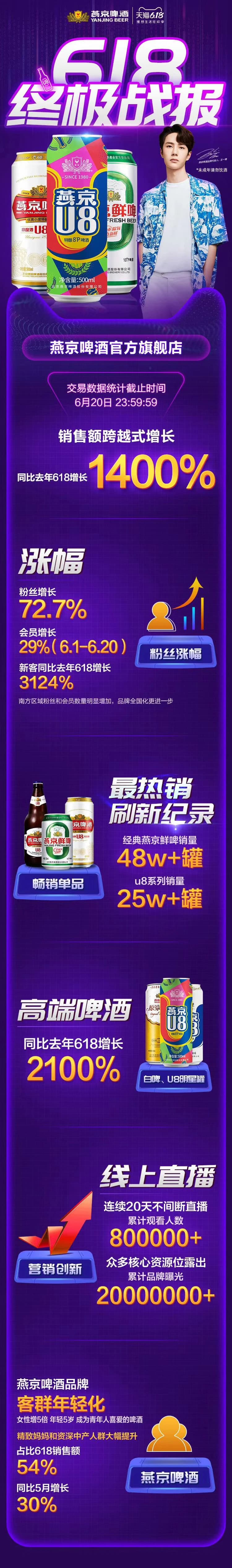 5月9日,燕京啤酒正式对外宣告签约王一博为品牌代言人,同时推出国潮版“燕京U8”啤酒。随后,燕京啤酒携手天猫和阿里妈妈,在510新国货大赏和天猫618期间,通过定制化的营销活动,吸引年轻人的关注和购买,获得了极大的营销成功。