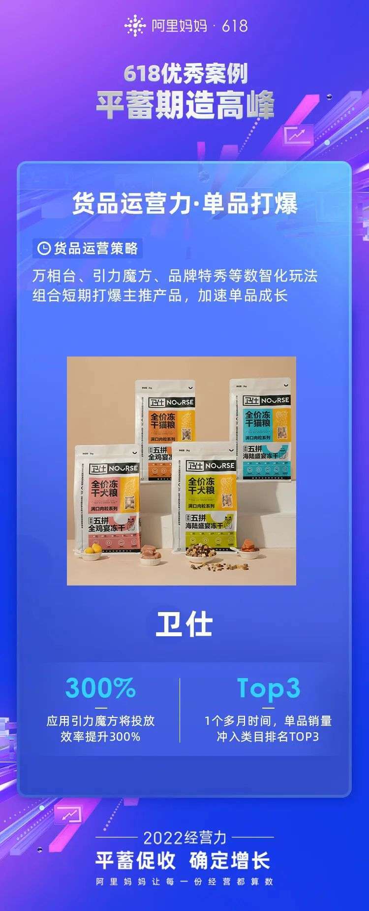 为此,卫仕自3月中旬发力,站内针对不同TA人群包投放不同素材,进行精准触达。同时,卫仕应用引力魔方,将投放效率提升300%,应用万相台各个场景化,投放期间根据需求和目标在不同场景灵活分配预算,达到流量和ROI最大化。此外卫仕通过品牌特秀投放,提升了种草规模。5月卫仕即将联合天猫大牌日IP及阿里妈妈数智化工具,助力单品持续爆发。一个多月时间,卫仕主推单品冲入类目排名TOP3,为618强势蓄水。