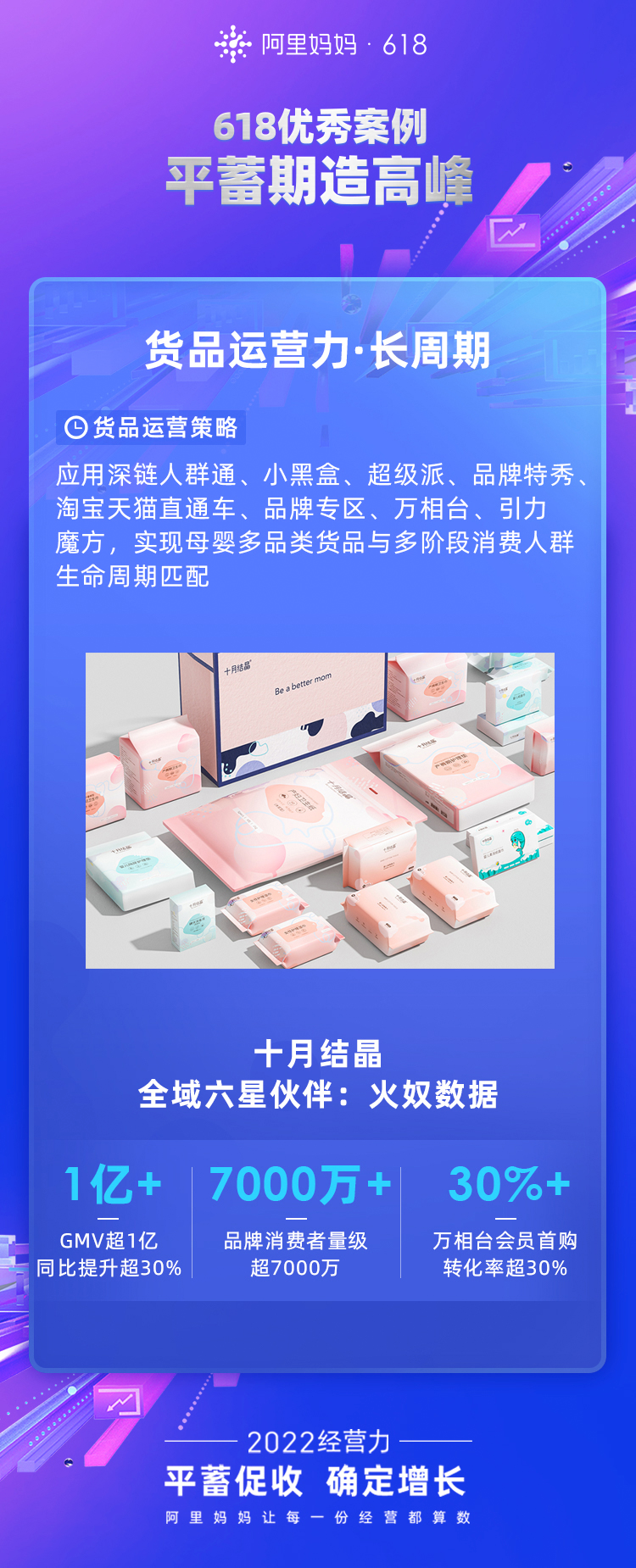 十月结晶产品线覆盖了母婴全阶段消费者,因此将多阶段人群的精准识别与个性化货品供给结合,延长消费者生命周期至关重要。此次备战618,十月结晶在生态伙伴火奴数据的助力下,将母婴多品类货品与消费者生命周期匹配,制定精细化的人货匹配策略。