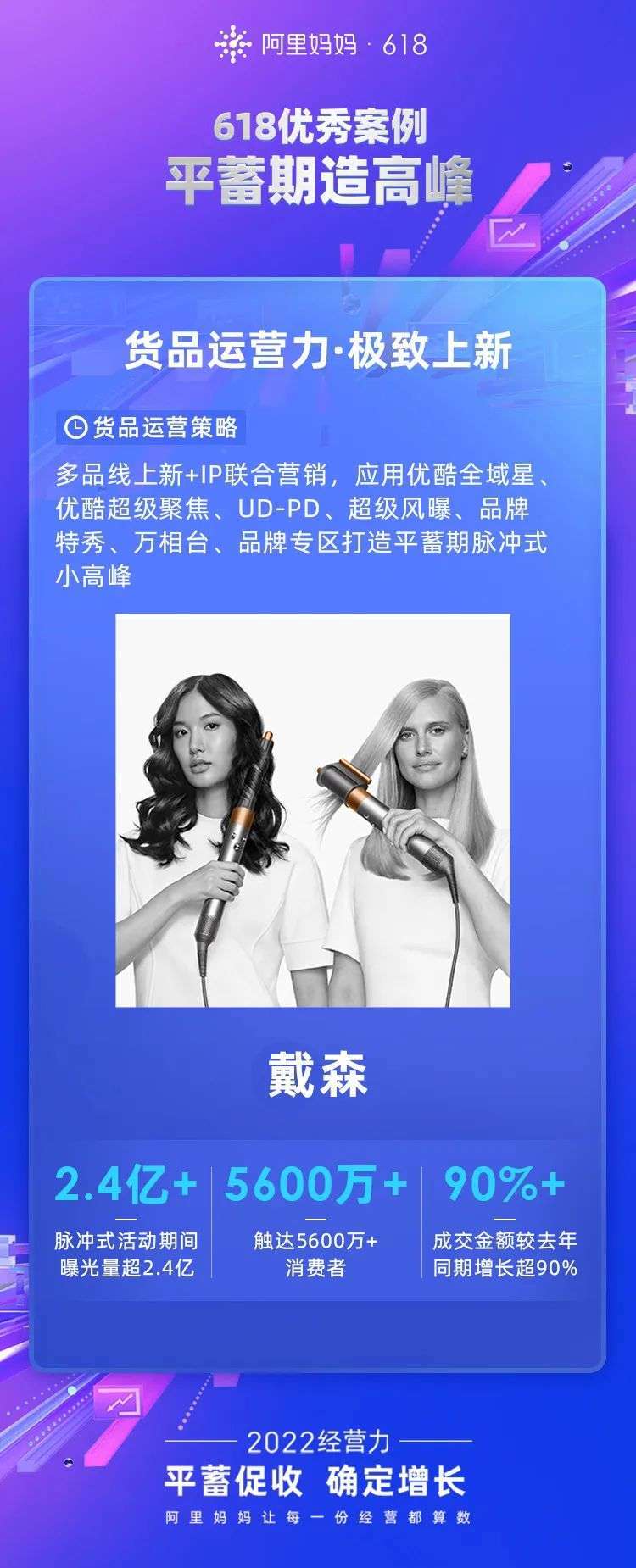 今年3月中旬,戴森发布卷发棒新品,通过新品云发布承接全网曝光热度,引领了美发行业新潮流。3月底,戴森推出全新穿戴设备,借力品牌专区高效承接了新品兴趣人群,并强化“科技创新先锋”的品牌定位。此后,依托阿里妈妈大外投、品牌特秀及万相台拉新快和上新快等场景化玩法,结合阿里妈妈数智化产品矩阵,戴森于4月超级品牌日无缝衔接了前序新品营销节奏,打造了戴森品牌上半年平蓄营销高峰,新品爆品全面爆发,为后续618大促积累了海量兴趣人群。