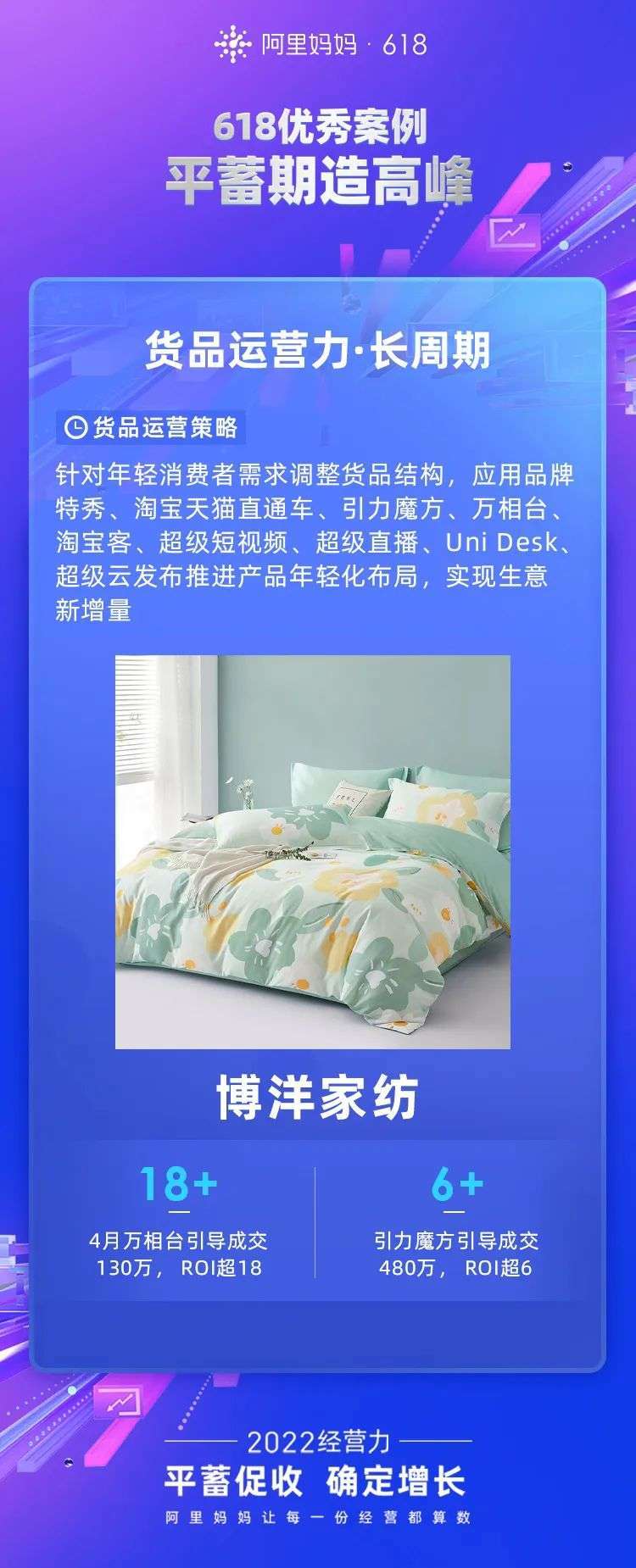 今年备战618,博洋家纺在尝试应用品牌特秀的同时,大大增强了万相台、引力魔方的应用程度,4月万相台引导成交130万,引力魔方引导成交480万,且都具备很好的ROI,让博洋家纺找到了推进品牌年轻化的超强辅助。