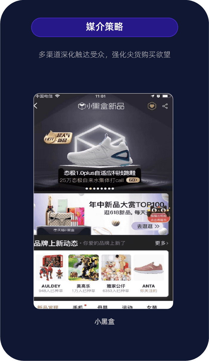人群策略找到全网所有对运动鞋有较强功能性需求的人群(品牌的核心科技是鞋底回弹技术),从多个维度对人群进行触达;热门网红鞋款的关注人群;竞品人群精细化运营,再与品牌的受众基础属性进行交叉;同时向泛运动鞋受众进行大曝光。