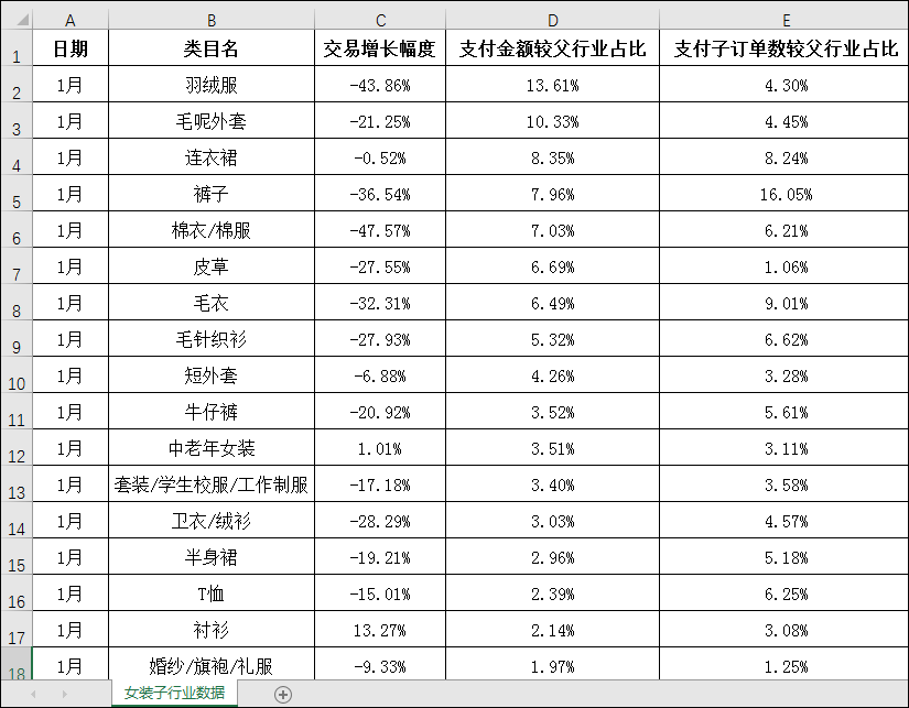 学员通过源数据2-1 女装子行业原始数据可以获取小张统计出的女装子行业构成数据。学员以个人为单位,将获取到的数据整理到Excel表格中,整理后的效果如图2-1所示。